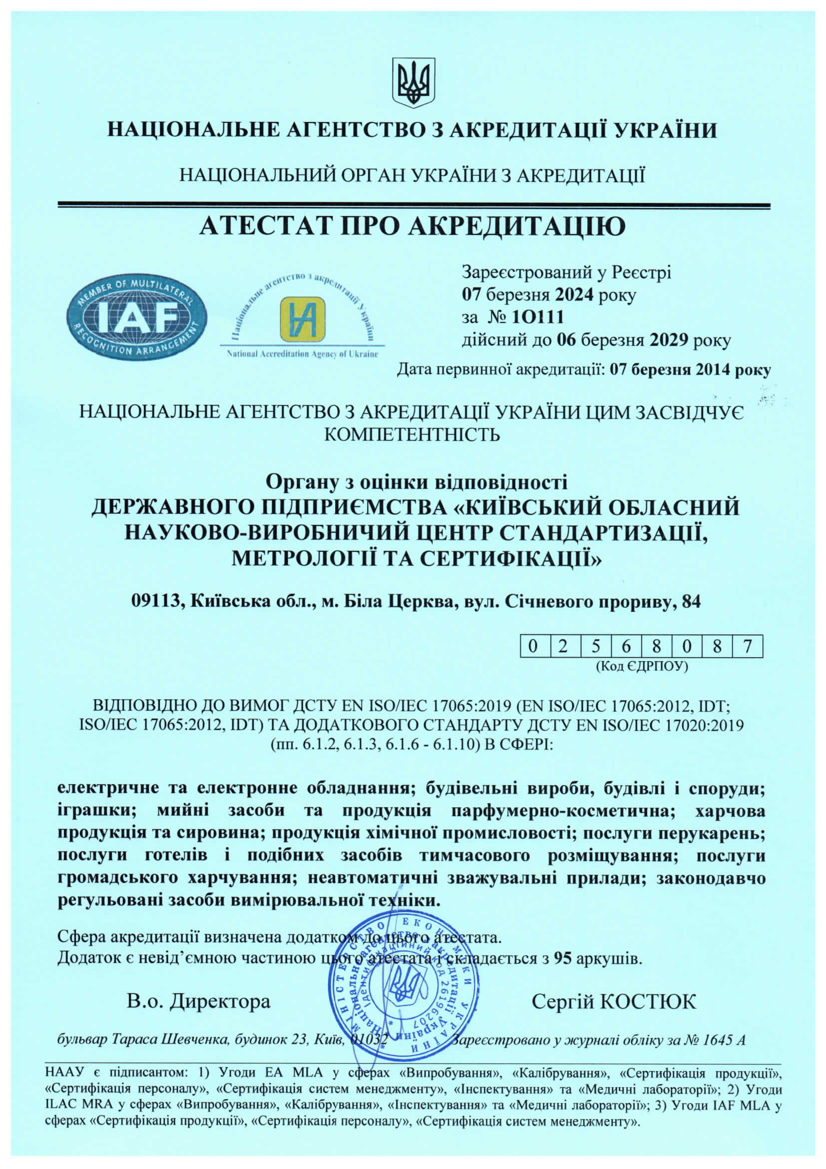 Орган з оцінки відповідності ДП “КИЇВОБЛСТАНДАРТМЕТРОЛОГІЯ” здійснює роботи з сертифікації партії продукції та продукції, що виробляється серійно за напрямками:
