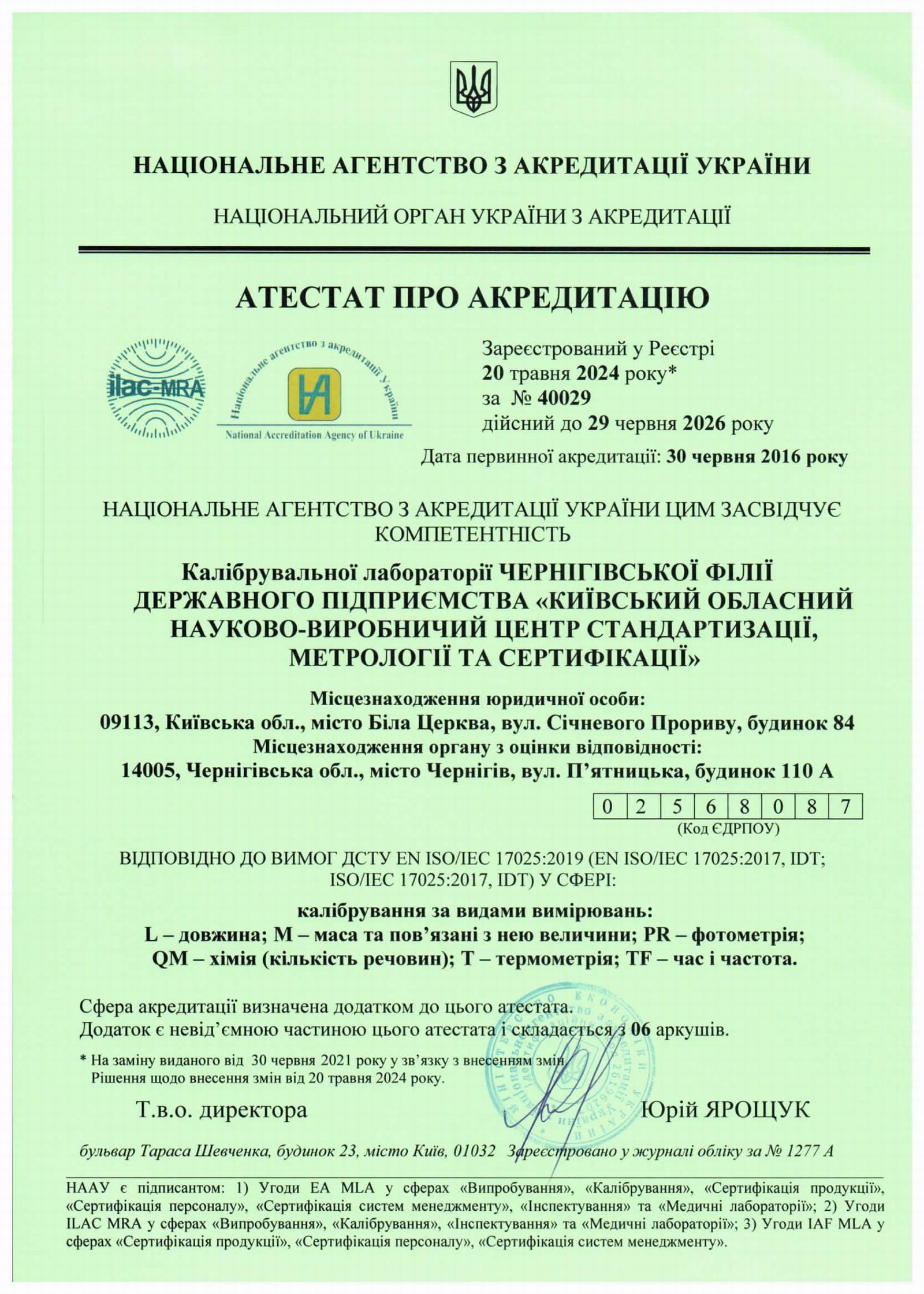 ДП “КИЇВОБЛСТАНДАРТМЕТРОЛОГІЯ” акредитована НАЦІОНАЛЬНИМ АГЕНСТВОМ З АКРЕДИТАЦІЇ УКРАЇНИ (НААУ) відповідно до вимог ДСТУ EN ISO/IEC 17025:2019 (EN ISO/IEC 17025:2017, IDT; ISO/IEC 17025:2017, IDT).