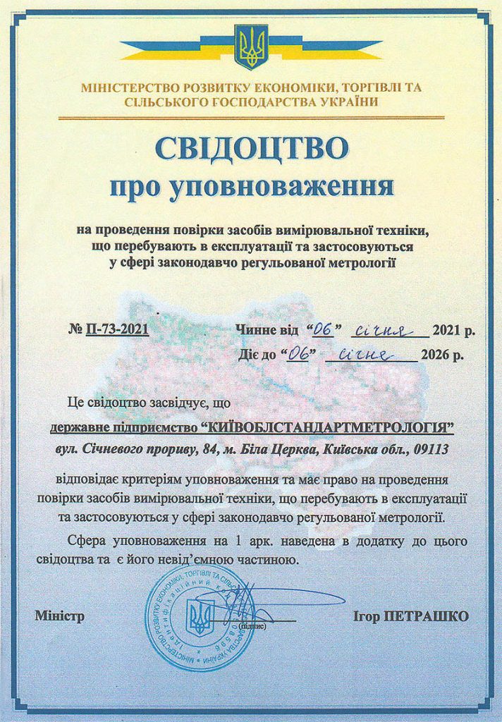 ДП “КИЇВОБЛСТАНДАРТМЕТРОЛОГІЯ” УПОВНОВАЖЕНО НА ПРОВЕДЕННЯ ПОВІРКИ ЗАСОБІВ ВИМІРЮВАЛЬНОЇ ТЕХНІКИ, ЩО ПЕРЕБУВАЮТЬ В ЕКСПЛУАТАЦІЇ ТА ЗАСТОСОВУЮТЬСЯ У СФЕРІ ЗАКОНОДАВЧО РЕГУЛЬОВАНОЇ МЕТРОЛОГІЇ (СВІДОЦТВА ПРО УПОВНОВАЖЕННЯ № П-25-2019 ВІД 07 ЧЕРВНЯ 2019 р., № П-73-2021 ВІД 06 СІЧНЯ 2021 р., № П-134-2024 ВІД 27 ЧЕРВНЯ 2024 р.).