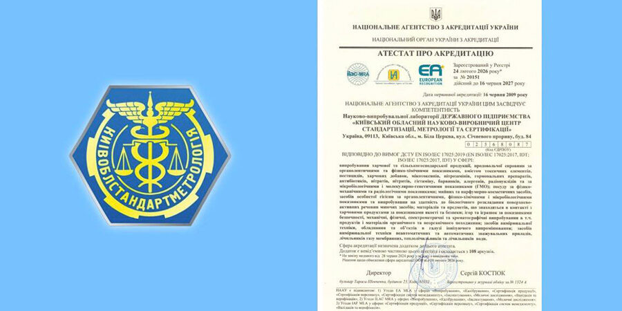 За результатами оцінки науково-випробувальної лабораторії на відповідність вимогам ДСТУ EN ISO/IEC 17025:2019 Національним агентством з акредитації України (НААУ) АТЕСТАТОМ ПРО АКТЕДИТАЦІЮ від 24лютого 2026 року за № 20151 підтверджено компетентність науково-випробувальної лабораторії ДЕРЖАВНОГО ПІДПРИЄМСТВА “КИЇВСЬКИЙ ОБЛАСНИЙ НАУКОВО-ВИРОБНИЧИЙ ЦЕНТР СТАНДАРТИЗАЦІЇ, МЕТРОЛОГІЇ ТА СЕРТИФІКАЦІЇ” (ДП “КИЇВОБЛСТАНДАРТМЕТРОЛОГІЯ”).