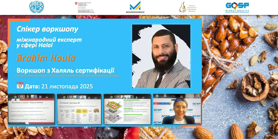 Воркшоп проведено за підтримки UNIDO — United Nations Industrial Development Organization GQSP Ukraine у партнерстві з Українською Асоціацією Халяль Індустрії “Укрхаляль”.